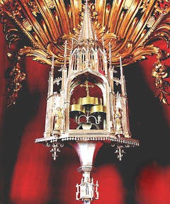 die Geschichte des heiligen Schatz, aber auch den vergeblichen Versuch der Schweden, die Marienstatue zu stürzen, aber auch die Feuersbrunst von 1669. Im Andechser Heiligenhimmel werden sind Menschen um die Dreihostienmonstranz versammelt. Es sind
